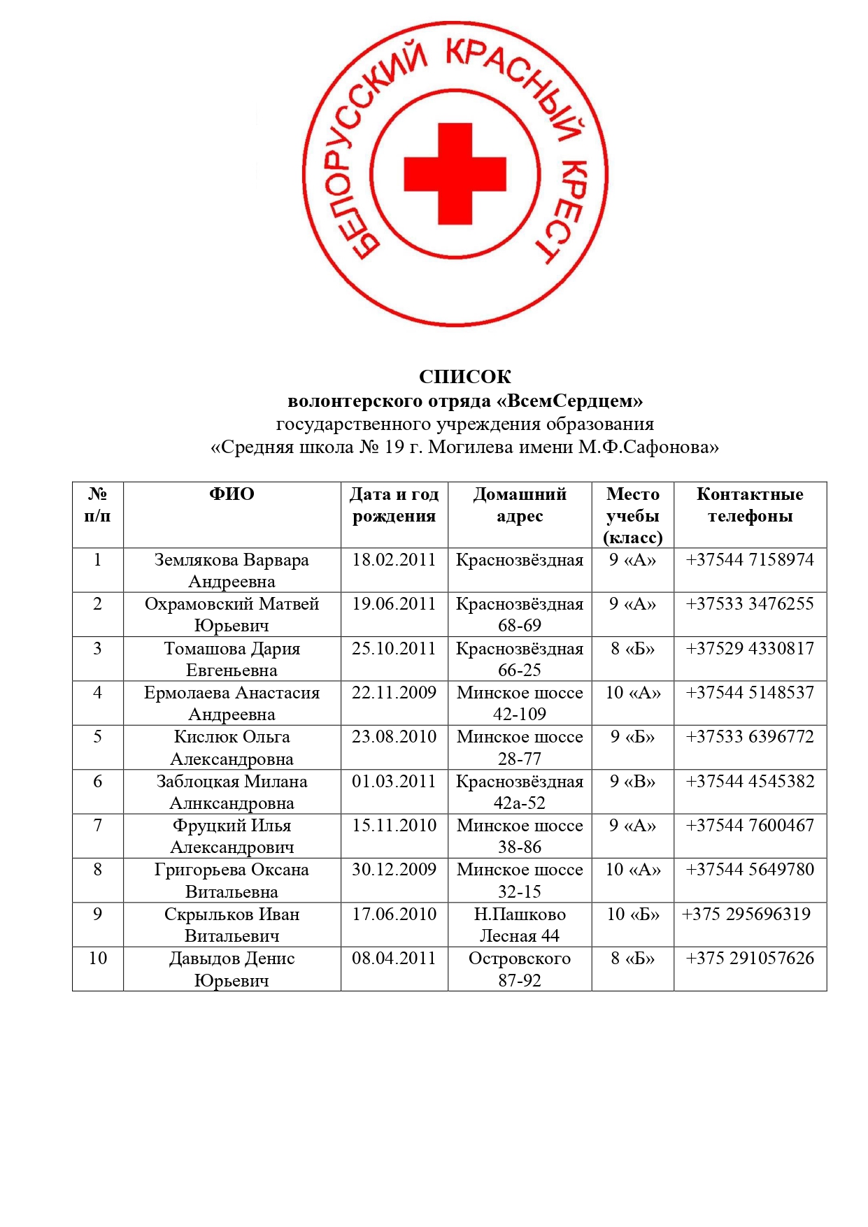 | План совместной деятельности волонтёрского отряда «Всем Сердцем» государственного учреждения образования «Средняя школа № 19 г. Могилева имени М.Ф.Сафонова» и Ленинской районной организации Белорусского Общества Красного Креста г. Могилева на 2025/2026 учебный год |